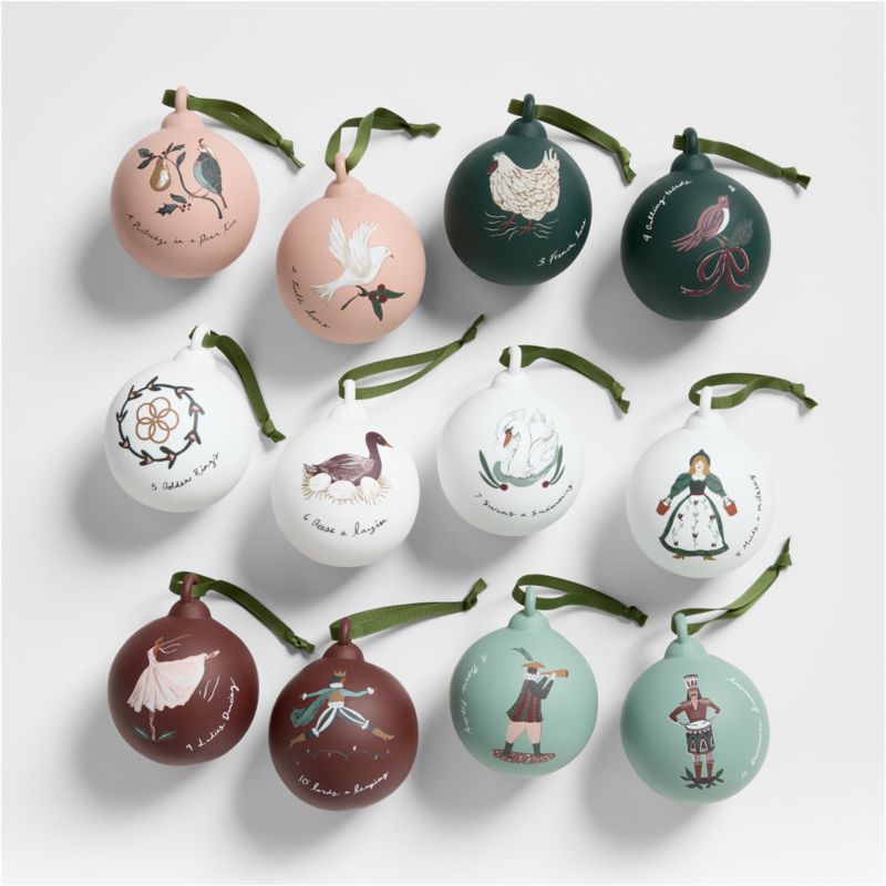 From the lone partridge to the dozen drummers, each ornament in this festive set depicts one of the 12 gifts described in the popular Christmas carol. Hand-drawn figures with scripted captions resemble fairytale illustrations, lending a bit of whimsy and a pop of color to holiday decor. Finished with green grosgrain ribbons, our porcelain ball ornaments give your tree a cohesive, folk art look in a modern palette.