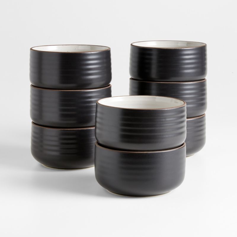 Modern and restrained in form, expressive and rustic in glaze. The artisan's hand is authentically reproduced in this stoneware pattern designed exclusively for Crate & Barrel by ceramic artist and designer Kathy Erteman at her 18th Street studio in New York City. The collection's straight-sided cereal bowl has a contemporary matte black exterior that contrasts with the rustic beauty of a shiny, speckled white glazed interior ringed with the subtly raised spiral associated with hand-thrown pieces. Raised clay rims feature a sandy glaze that evokes the feel of exposed terracotta. To capture the artisan look of this dinnerware, Erteman modeled prototypes to true scale by hand with her original glazes as reference for production. In the words of the designer, "When making tableware, I consider design and the rigors of daily use. The spirit of my hand in these pieces is modest, to harmonize with and act as a support to the prepared ingredients." This set of eight bowls serves cereal, salads, ice cream and more.
