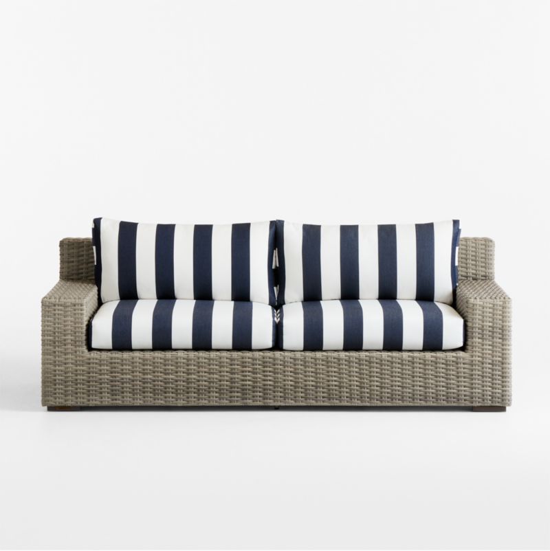 Abaco 83" Resin Wicker Outdoor Sofa with Navy and White Cabana Stripe Sunbrella® Cushions