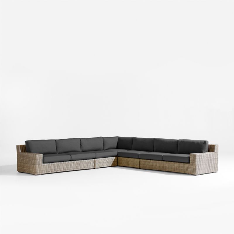Low-slung and ready to lounge, our Abaco outdoor sectional sofa extends an invitation to kick back and relax. Comprising a corner, two armless chairs and left- and right-arm sofas, the five-piece sectional offers a deep seat and wide, boxy arms perfect for a cool drink. Handwoven with a chunky, textural weave, the weather-resistant resin wicker exhibits a variety of grey-brown shades to replicate the nuanced color of well-worn rattan. charcoal grey cushions covered in fade-, stain-, water- and mildew-resistant Sunbrella acrylic add an extra layer of comfort to the L-shaped sectional.