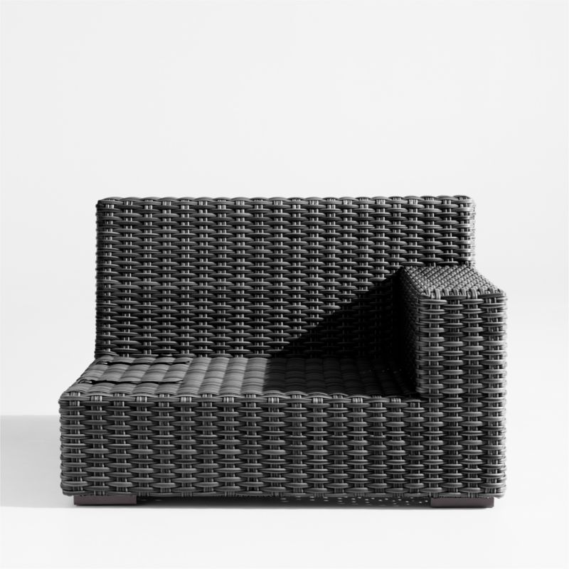 Low-slung and ready to lounge, our Abaco outdoor sectional collection extends an invitation to kick back and relax. Each right-arm chair is handwoven of dark charcoal grey, weather-resistant resin wicker in a chunky, textural weave. The chair's modern, boldly proportioned frame of lightweight aluminum offers a deep seat and a wide, boxy arm that's perfect for hosting a cool drink. Add on a layer of comfort with custom-designed cushions in a range of colors (sold separately). The right-arm chair combines with other Abaco sectional components to fashion outdoor seating tailored to your great outdoors.