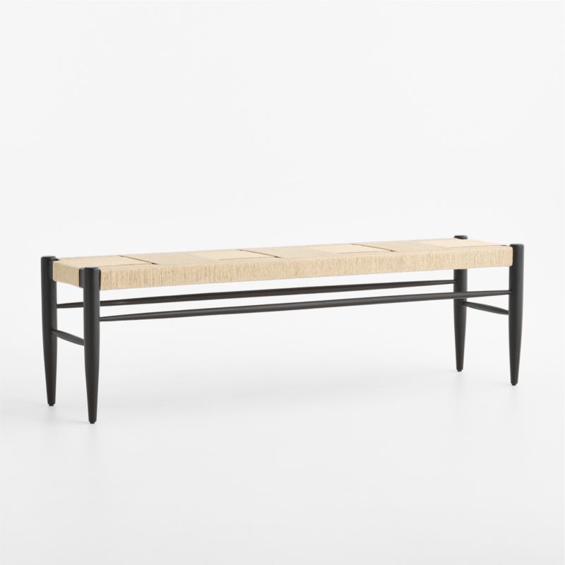 Our Adriel bench blends the warmth of farmhouse style with the sophisticated simplicity of Scandinavian design. The acacia frame draws on tradition with tapered legs and pillowed stretcher bars, made contemporary with a streamlined design, bullnose ends and a wirebrushed black finish to bring out the grain. The seat echoes traditional rush chairs, wrapping the frame in a modern pattern that crisscrosses wide bands of handwoven paper cord in a natural beige color.