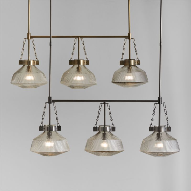 Subtly sparkling ribbed glass complements metal finishes in our Aiden linear pendants. Faceted and textured with fine lines, the glass shades softly obscure the bulbs within for a more diffuse glow. Finely linked chains and knurled thumb screws secure the shades and provide a textural touch. Install the Aiden ribbed glass three-light pendants over a kitchen island or dining table for illumination with a vintage feel.