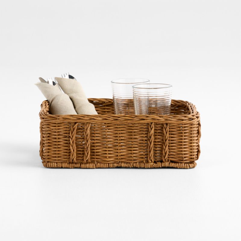 Our versatile Alford wicker collection now includes display-worthy storage options to keep all of your essentials corralled in style. Stained golden honey-brown, natural rattan is handwoven by skilled craftspeople into a low, wide basket perfectly sized for slippers by the front door or cutlery and condiments on an outdoor dining table. Cutout handles make the bin easy to tote, while braided accents emphasize the basket's artisanship and elevated organic beauty. Combine with our other woven Alford pieces for a new take on a timeless classic.