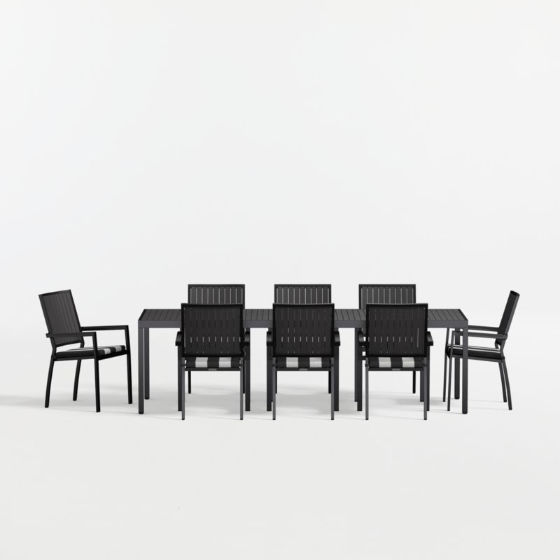 Alfresco 103" Black Metal Outdoor Dining Table Set with Black and White Cabana Stripe ® Sunbrella Cushions