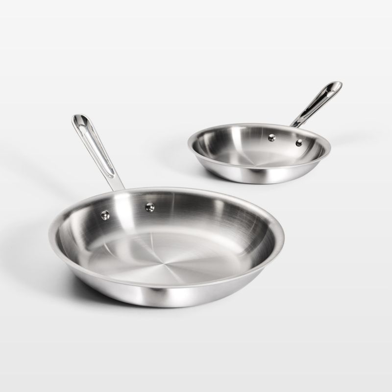Put the cookware that's found in many four-star kitchens to work for you. These professional-grade, triple-ply frying pans from All-Clad are made with extra-thick, pure aluminum cores that extend from the bottom all the way up the sides for superior heat performance. Bonded to the aluminum cores are stainless steel cooking surfaces that won't react with food and stainless exteriors polished to a high shine. The durable skillets distribute heat evenly and precisely for restaurant-level searing, sauteing and deglazing. Perfect for everyday use with all types of stovetops, the 8- and 10-inch fry pans stand up to high oven and broiler temperatures.