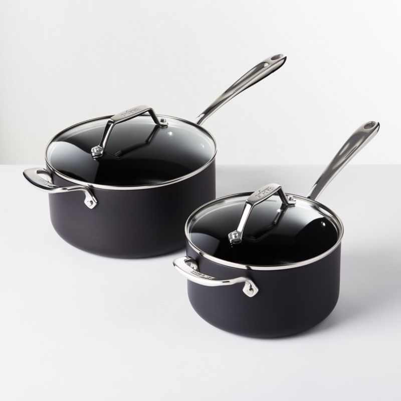 Go from stove to oven and vice versa with this versatile pair of non-stick saucepans. With two lidded pans for cooking soups, stews, sauces as well as jams, custards, the set comes in handy constantly—even just for boiling water. The non-stick coating releases foods easily, and the hard-anodized pans clean up easily in the dishwasher. Glass lids allow you to keep an eye on your meal's progress, stainless steel handles provide a sturdy grip, and the pans nest neatly without scratching when cooking is complete. Set includes 2.5- and 4-quart saucepans with lids.