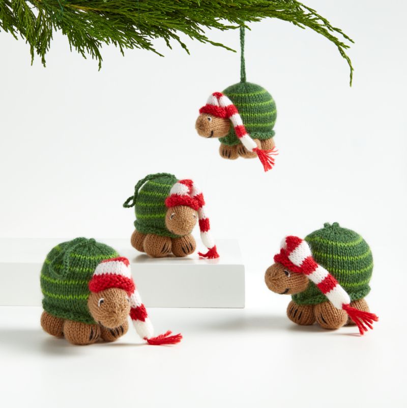 Artisanal and downright delightful, our turtle ornaments are knit by hand from super-soft alpaca-blend yarn. These four fashion-savvy turtles don red-and-white striped stocking caps to set off their naturally attractive green-striped shells. Part of our exclusive alpaca decoration collection, the turtle Christmas tree ornaments also make sweet gift toppers.
