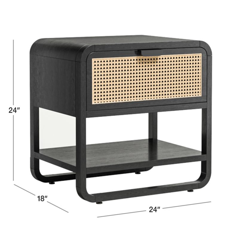 Channeling 1930s curves and mid-century caning, Anaise flirts with tradition in an eye-catching design that's totally now. Mindi veneer rounds the nightstand's corners, flowing legs, feet and top in a seamless silhouette. A black stain provides the perfect counterpoint to the warm color and woven texture of natural cane that fronts the nightstand's single drawer. Contemporary yet approachable, the nightstand is part of Crate and Barrel's exclusive Anaise bedroom collection.