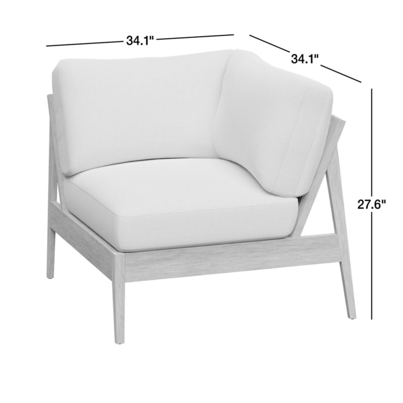 Our Andorra outdoor sectional owes its coastal cool vibe to fine workmanship and contemporary lines. Designed to look good from any view, the chair's mahogany frame resembles the bow of a ship with its pointed corner and slatted backrests made of bentwood eucalyptus. Legs set at an eye-catching angle continue the dynamic lines. Wire brushing and a grey-brown finish replicate the look of sea-weathered wood, while a weather-resistant taupe seat-and-back cushion adds an extra layer of stay-awhile comfort. To build a sectional sofa that's right for your space, combine the corner chair with your choice of other sectional components.