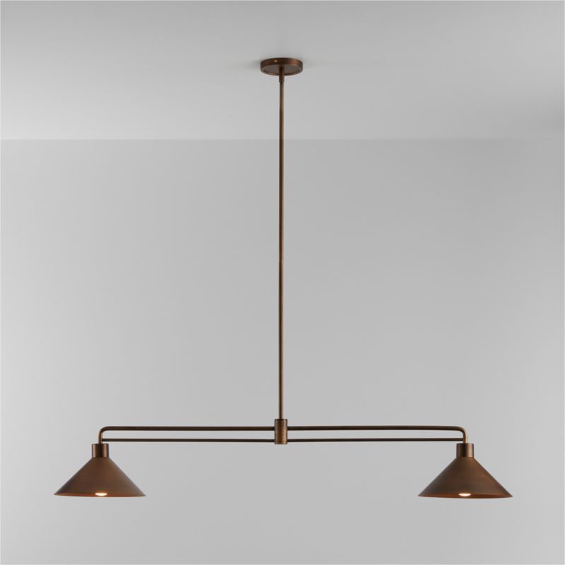 Airy and graceful in gleaming burnished brass, our Andre pendant graces your home like a piece of minimalist jewelry. A series of slender tubes support two conical shades that cast a warm glow. Hung over a dining table, in a hallway or above a kitchen island, the perfectly balanced two-light pendant offers an illuminating mix of task and ambient lighting.