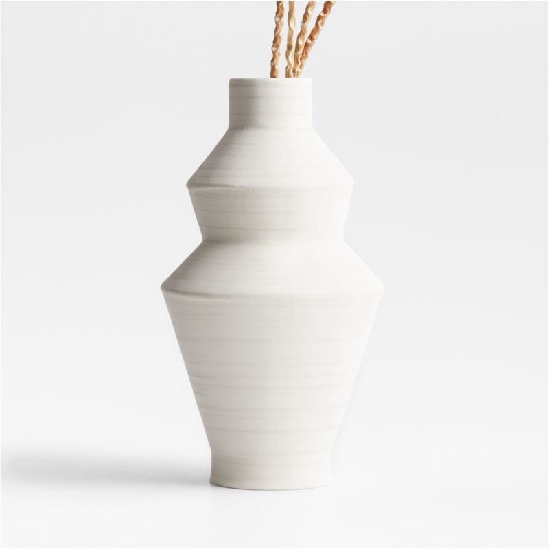 Our Angle vase stacks a contemporary, angular take on the classic gourd vase. Glazed matte cream with subtly glossy rings, the ceramic vessel has an organic finish that softens its jagged silhouette. The tall vase displays dried or faux botanicals, mixes effortlessly with our modern vases or stands alone with a sculptural presence.