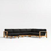 Our Anguilla three-piece sectional is a beautiful, worry-free place to spend lazy days outdoors. Exceptionally durable solid teak frames the sectionals angular silhouette, while thick, comfortable cushions covered in weather-resistant upholstery lull you into warm-weather bliss. Combining a right-arm chaise and left-arm sofa with an armless chair, the three-piece sectional sofa is crafted with roomy seats, solid construction and sleek lines for ideal patio or poolside lounging.