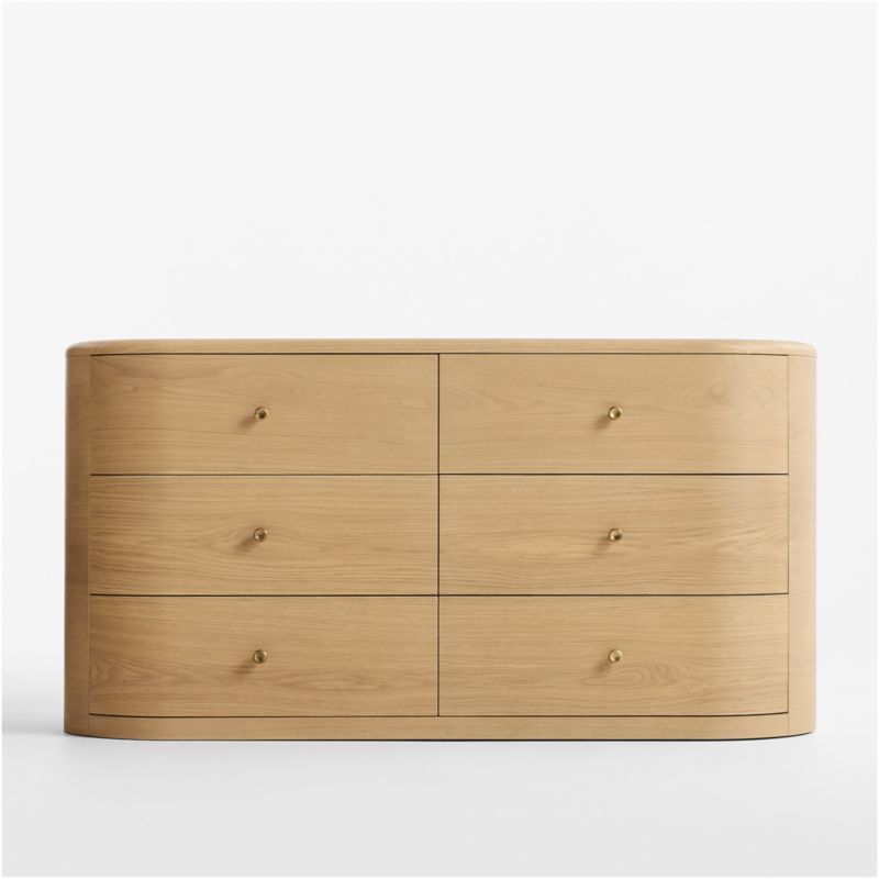 Designed to complement the contours of our Anneli bed, the six-drawer dresser sculpts a racetrack silhouette in gorgeously grained oak. Curved drawer fronts flow flush with the rounded frame, echoing the capsule shape of the seamless radius-edged top. Petite knobs accent the facade with the subtle glow of burnished brass, enhancing the dresser's clean, contemporary aesthetic.