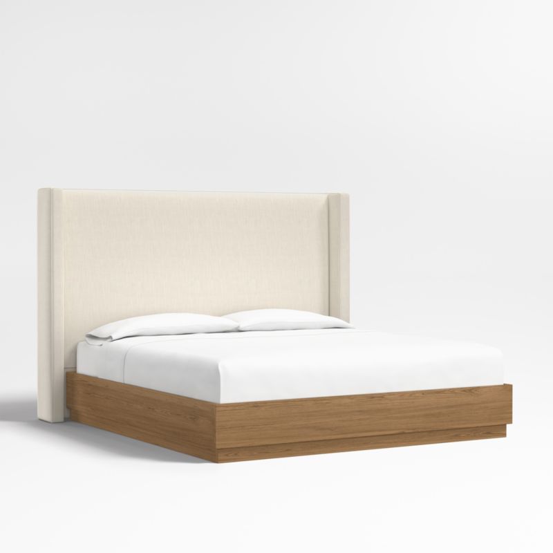 Our custom bed collection lets you mix and match our top-selling headboards and bases for a look that's truly yours. Upholstered in an ivory linen blend with topstitched detailing, our Arden tall headboard surrounds with wingback contours and comfy padding. The headboard wraps onto the Batten bed base, which complements Arden's tailored curves with a sleek plinth design and the lively grain of oak veneer enhanced with a smoke grey finish.