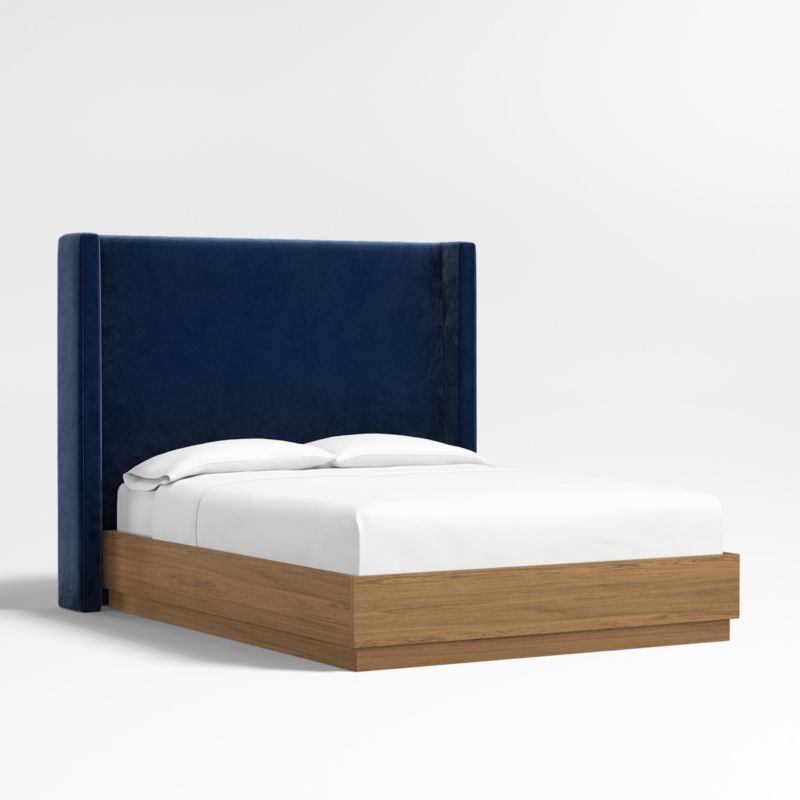 Our custom bed collection lets you mix and match our top-selling headboards and bases for a look that's truly yours. Upholstered in plush navy blue faux mohair with topstitched detailing, our Arden tall headboard surrounds with wingback contours and comfy padding. The headboard wraps onto the Batten bed base, which complements Arden's tailored curves with a sleek plinth design and the lively grain of oak veneer enhanced with