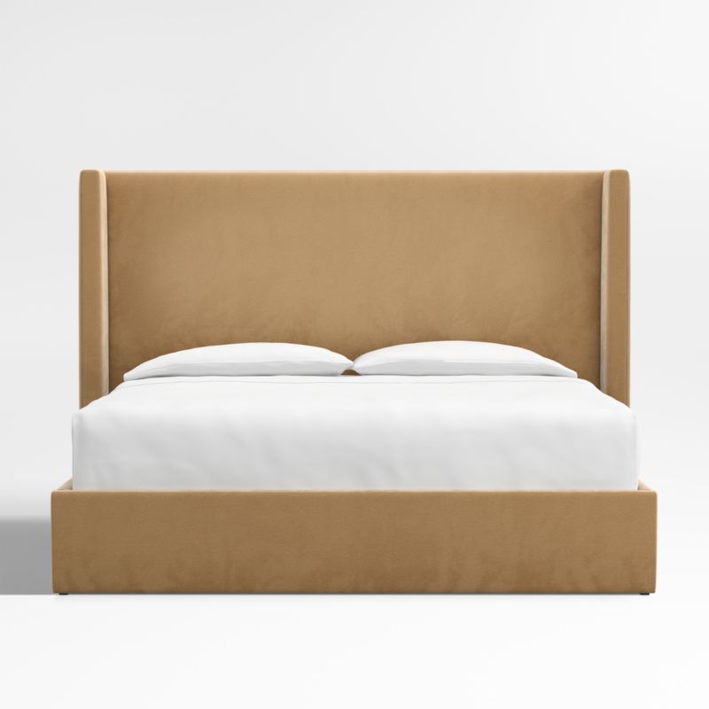 Our custom bed collection lets you mix and match our top-selling headboards and bases for a look that's truly yours. Fully upholstered in plush camel brown faux mohair, our Arden headboard and storage base are amply padded and neatly tailored with topstitching. The tall shelter headboard with wingback contours and comfy padding wraps onto the base, which integrates three roomy drawers—one on each side and one at the foot of the bed—for storing off-season clothes and extra blankets. As a plus, the side drawers open with just enough clearance to avoid hitting nightstands and other bedroom furniture.