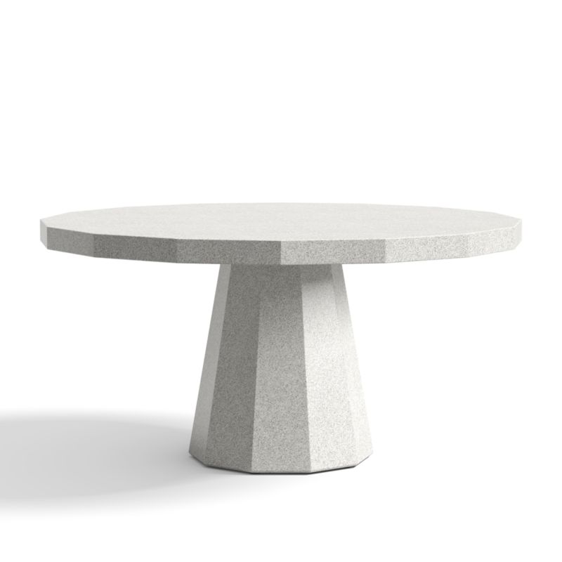 Ari extends a gracious invitation for outdoor dinners and alfresco conversations. Fashioned with facets for geo-forward flair, the stone table features a tapered column pedestal and an expansive top to comfortably seat up to eight. A neutral finish is flecked with grey, adding interest to the sculptural silhouette.