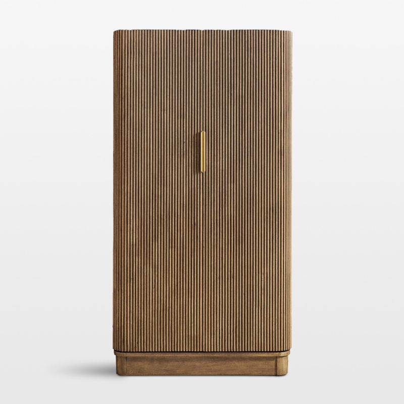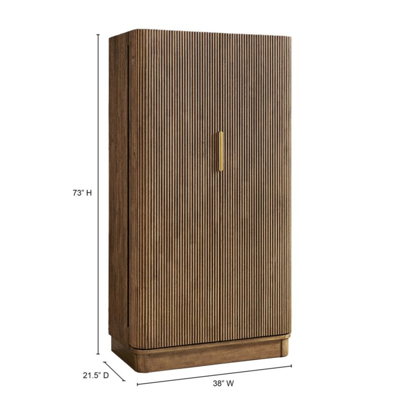 Aria elevates the art of entertaining, housing a full-service bar within a beautifully crafted exterior. Finished in warm umber to accentuate the wood grain and architectural detailing, the cabinet features vertical fluting and an articulated plinth base. Gold-finished linear pulls open the double-doored cabinet to reveal a generously sized and well-appointed interior. Both doors are outfitted with four railed shelves to house bottles, complemented by two central shelves for storing wine bottles. Illuminated by LED lights, the workstation has an overhead stemware rack, mirrored back panel, two pull-out boards for additional prep space and two drawers for storing bar tools, napkins, corkscrews and bottle openers.