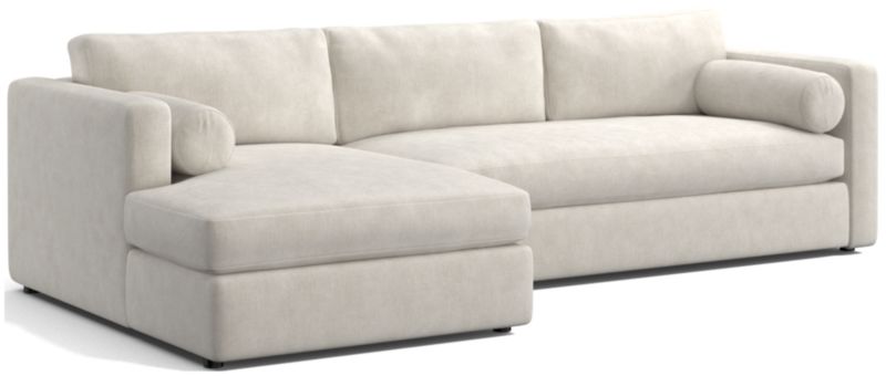 Destined to be everyone's favorite spot to chill, our Aris sectional makes modern design soft and cozy. Consisting of a left-arm chaise and right-arm sofa, the clean-lined sectional features neat track arms and a broad deck. Comfy bench seats and back cushions invite the gang to get comfortable. A couple of bolster pillows help get the snuggle just right. The Aris two-piece sectional is a Crate & Barrel exclusive.