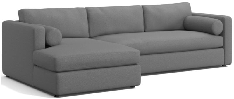 Destined to be everyone's favorite spot to chill, our Aris sectional makes modern design soft and cozy. Consisting of a left-arm chaise and right-arm sofa, the clean-lined sectional features neat track arms and a broad deck. Comfy bench seats and back cushions invite the gang to get comfortable. A couple of bolster pillows help get the snuggle just right. The Aris two-piece sectional is a Crate & Barrel exclusive.