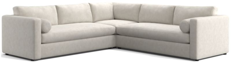 Destined to be everyone's favorite spot to chill, our Aris sectional makes modern design soft and cozy. Consisting of a corner flanked by left- and right-arm sofas, the clean-lined sectional features neat track arms and broad decks. Comfy bench seats and back cushions invite the gang to get comfortable, assisted by a couple of bolster pillows to get the snuggle just right. The Aris three-piece sectional is a Crate & Barrel exclusive.