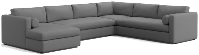 Destined to be everyone's favorite spot to chill, our Aris sectional makes modern design soft and cozy. This four-piece sectional—left-arm chaise, corner, armless loveseat and right-arm sofa— features neat track arms and broad decks for clean, modern lines. Comfy bench seats and back cushions invite the gang to get comfortable, assisted by a couple of bolster pillows to get the snuggle just right. The Aris sectional is a Crate & Barrel exclusive.