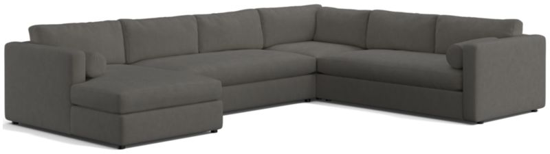 Destined to be everyone's favorite spot to chill, our Aris sectional makes modern design soft and cozy. This four-piece sectional—left-arm chaise, corner, armless loveseat and right-arm sofa—features neat track arms and broad decks for clean, modern lines. Deep bench seats and plump back cushions invite the gang to get comfortable, assisted by a couple of bolster pillows to get the snuggle just right. The Aris sectional is a Crate & Barrel exclusive.