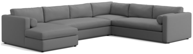Destined to be everyone's favorite spot to chill, our Aris sectional makes modern design soft and cozy. This four-piece sectional—left-arm chaise, corner, armless loveseat and right-arm sofa—features neat track arms and broad decks for clean, modern lines. Deep bench seats and plump back cushions invite the gang to get comfortable, assisted by a couple of bolster pillows to get the snuggle just right. The Aris sectional is a Crate & Barrel exclusive.