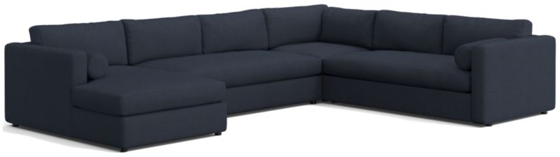 Destined to be everyone's favorite spot to chill, our Aris sectional makes modern design soft and cozy. This four-piece sectional—left-arm chaise, corner, armless loveseat and right-arm sofa—features neat track arms and broad decks for clean, modern lines. Deep bench seats and plump back cushions invite the gang to get comfortable, assisted by a couple of bolster pillows to get the snuggle just right. The Aris sectional is a Crate & Barrel exclusive.