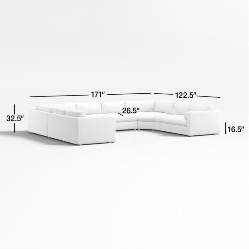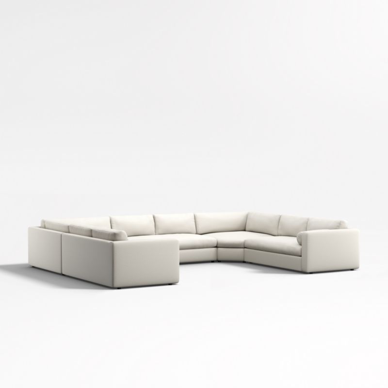 Destined to be everyone's favorite spot to chill, our Aris sectional makes modern design soft and cozy. This five-piece sectional—right-arm sofa, two wedges, armless loveseat and left-arm sofa—features neat track arms and broad decks for clean, modern lines. Deep bench seats and plump back cushions invite the gang to get comfortable, assisted by a couple of bolster pillows to get the snuggle just right. The Aris U-shaped sectional is a Crate & Barrel exclusive.