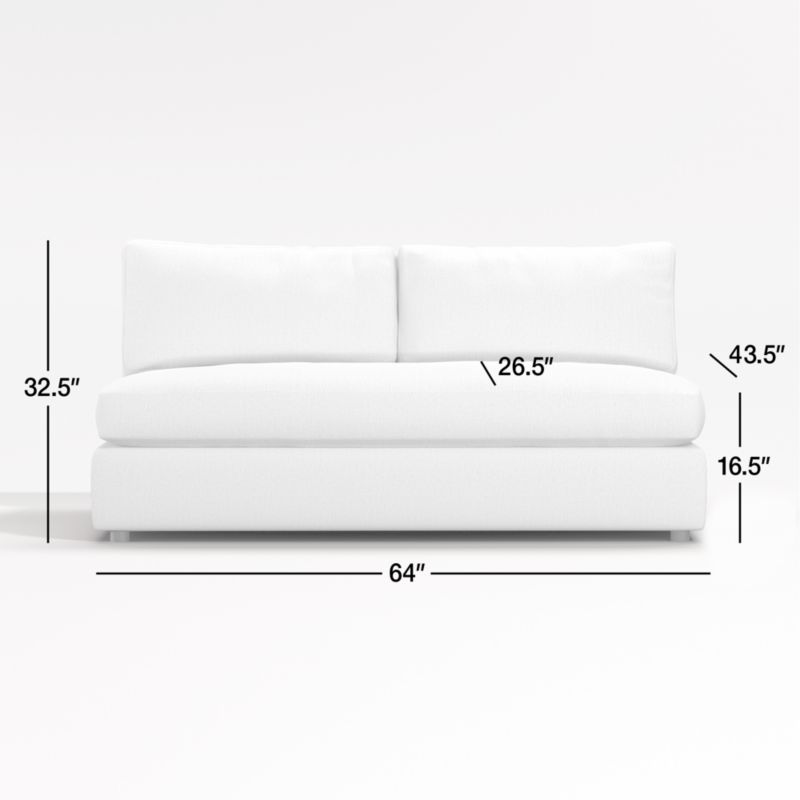 Aris Deep Leather Armless Bench Loveseat Sectional Piece31.25"Hheight64"Wwidth43.5"DdepthMeasurements are in inches.79.38Hheight162.56Wwidth110.49DdepthcmMeasurements are in centimeters.