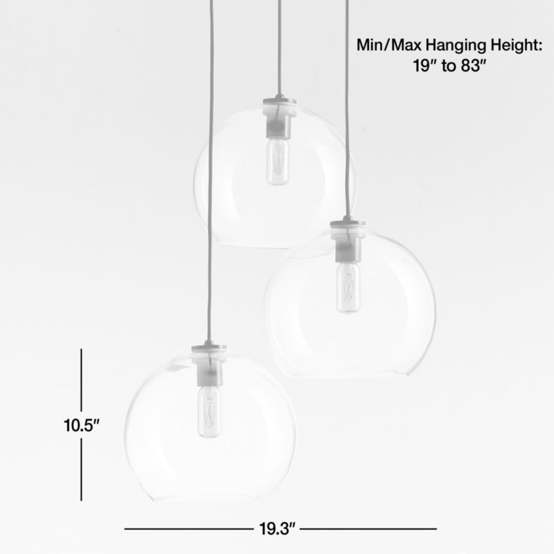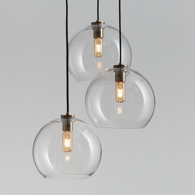 Arren suspends a trio of oversized, bubble-like shades from an iron fixture finished in brass, the large clear glass globes hanging from a round ceiling plate and adjustable black fabric cords. Boasting clean lines and graceful proportions, the three-light pendant creates a striking cluster of light above a breakfast nook or reading chair. Full of flexible lighting options with a custom feel, our modern-yet-timeless Arren lighting collection combines chandeliers, pendants, sconces and lamps in a variety of configurations and finishes with elegant glass shades available in four shapes and three finishes.