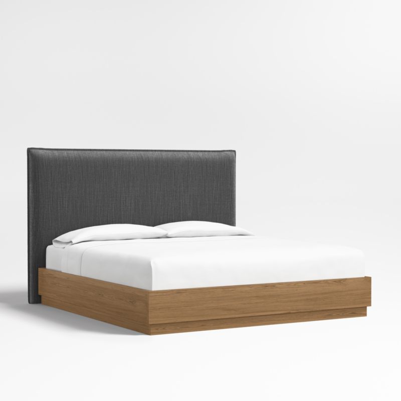 Our custom bed collection lets you mix and match our top-selling headboards and bases for a look that's truly yours. Upholstered in a charcoal grey textured weave with a casual flange border, our coastal-cool Arvada headboard offers pillow-like comfort. The Batten bed base complements Arvada's clean yet relaxed silhouette with a sleek plinth design and the lively grain of oak veneer enhanced with a smoke grey finish.