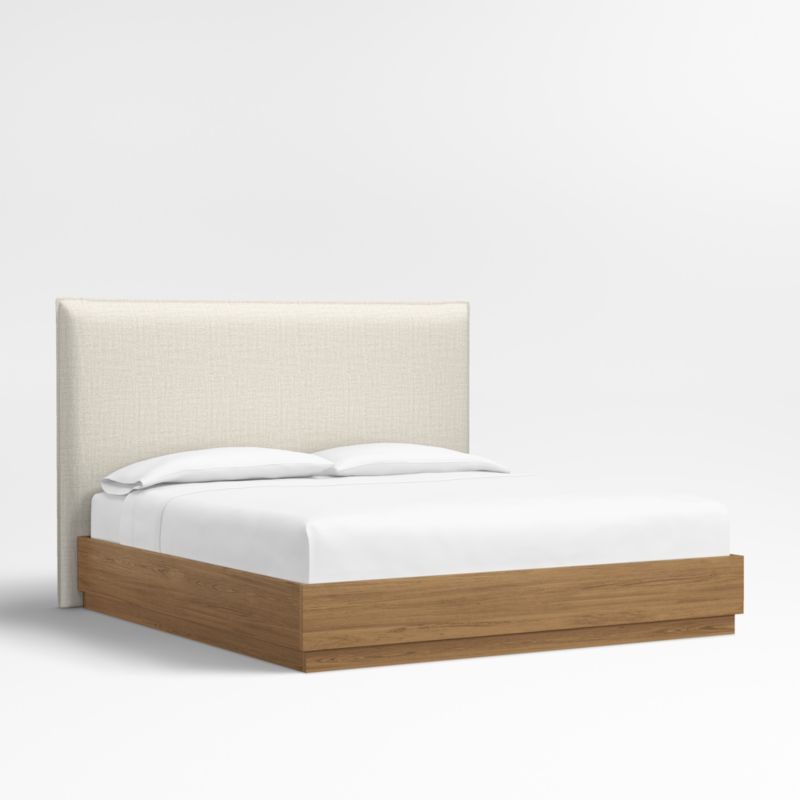 Our custom bed collection lets you mix and match our top-selling headboards and bases for a look that's truly yours. Upholstered in a beige textured weave with a casual flange border, our coastal-cool Arvada headboard offers pillow-like comfort. The Batten bed base complements Arvada's clean yet relaxed silhouette with a sleek plinth design and the lively grain of oak veneer enhanced with a smoke grey finish.