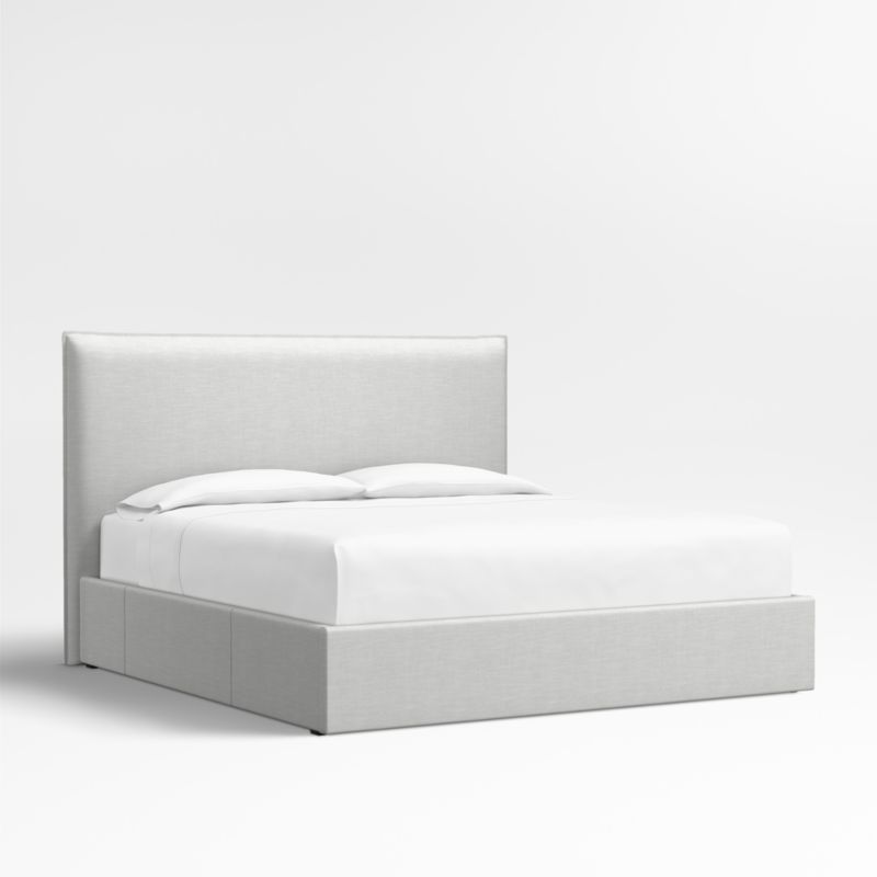 Our custom bed collection lets you mix and match our top-selling headboards and bases for a look that's truly yours. Our coastal-cool Arvada headboard offers pillow-like comfort and the casual look of a relaxed flange border, while the base integrates three roomy drawers—one on each side and one at the foot of the bed—for storing off-season clothes and extra blankets. As a plus, the side drawers open with just enough clearance to avoid hitting nightstands and other bedroom furniture. Both pieces are upholstered in a cool grey linen blend.