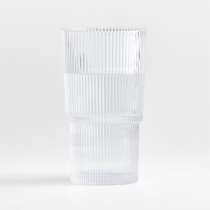 Sparkling tiers of ribbed glass shape cocktail glasses equally suited to tall servings of water, iced tea or beer. The countless glass ridges provide a sturdy handhold while catching the light. Dishwasher-safe for easy cleanup, our ribbed glasses are Crate & Barrel exclusives.