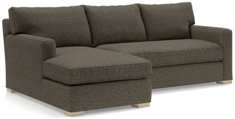 Same easygoing appeal, same pile-on comfort, and a sleek new bench cushion for this enduring customer favorite. The Axis sectional is well-loved for its deep seats and low back cushions that encourage lounging in family rooms and casual living rooms. We've refreshed the left-arm chaise and right-arm sofa with shale-stained maple legs and a hard-working chenille fabric with a hint of texture and a soft hand. The Axis two-piece sectional is a Crate & Barrel exclusive.