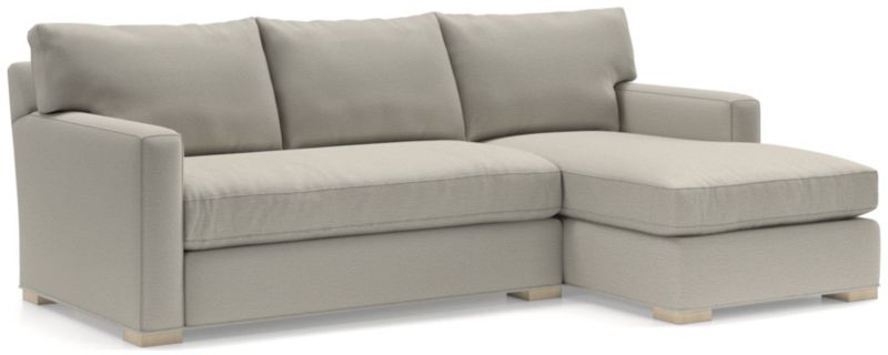 Same easygoing appeal, same pile-on comfort, and a sleek new bench cushion for this enduring customer favorite. The Axis sectional is well-loved for its deep seats and low back cushions that encourage lounging in family rooms and casual living rooms. We've refreshed the left-arm sofa and right-arm chaise with shale-stained maple legs and a hard-working chenille fabric with a hint of texture and a soft hand. The Axis two-piece sectional is a Crate & Barrel exclusive.