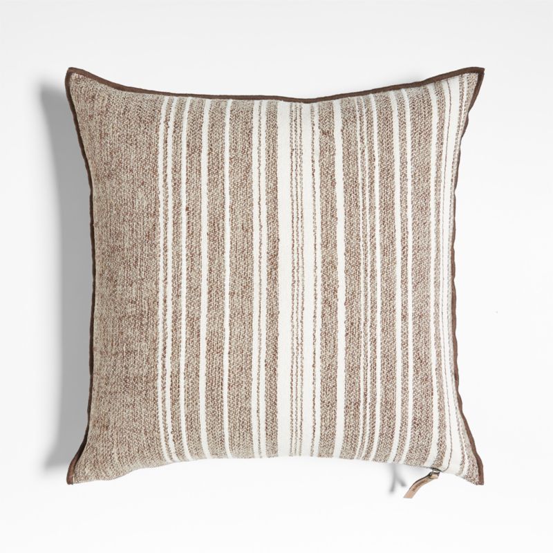 Offset, organically varied lines stripe our Bande throw pillow cover for a chic and casual look. Dyed a dark natural hue and creamy white to coordinate effortlessly with our bedding, the blend of linen and organic cotton threads weave a nubby, tweedy texture and a variegated pattern. Dark brown merrow stitching finishes the asymmetrical pillow cover with a touch of crisp contrast. For maximum comfort, fill our exclusive square pillow cover with a plush feather or lofty down-alternative insert sold separately.