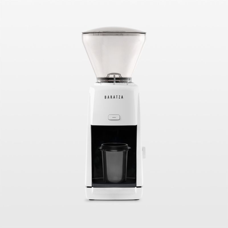 The white Baratza Encore ESP grinder features high-carbon steel burrs that produce precision-ground coffee optimized for espresso, while offering a full range of grind profiles perfect for exceptional coffee drinks from pour-over to French press. Adjustable to 40 different steps, this powerful grinder creates a consistent grind and is incredibly easy to operate and clean.