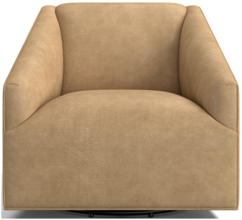 Baron brings maximum lounge to a sleek, modern style. Clean lines and tight tailoring draw the eye to the inviting waterfall seat, cushioned back and tapered arms with soft inside edges. Leather upholstery hugs every curve with a luxe look and buttery soft hand. A relaxing place to unwind, the swivel chair gives you a sweeping view of the room.