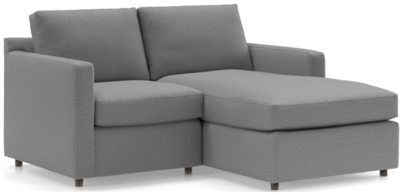 Barrett makes modern sectional seating affordable and carefree. A great choice for a small living or family room, this combination of left-arm chair and right-arm chaise sits upright yet relaxing. The two-piece sectional features comfy seat and back cushions on a trim frame with track arms and a low-rise back for a look that's casual and clean. The Barrett II small-space sectional is a Crate & Barrel exclusive.
