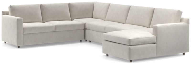Barrett makes modern sectional seating affordable and carefree. Upright yet comfortable, this versatile sectional looks casual and clean in a contemporary fabric that feels great to the touch and is so durable you don't need to worry about spills or pets. The four-piece sectional is designed to always look its best, even in high-traffic family rooms. The Barrett II 4-Piece Right Arm Chaise Sectional is a Crate & Barrel exclusive.