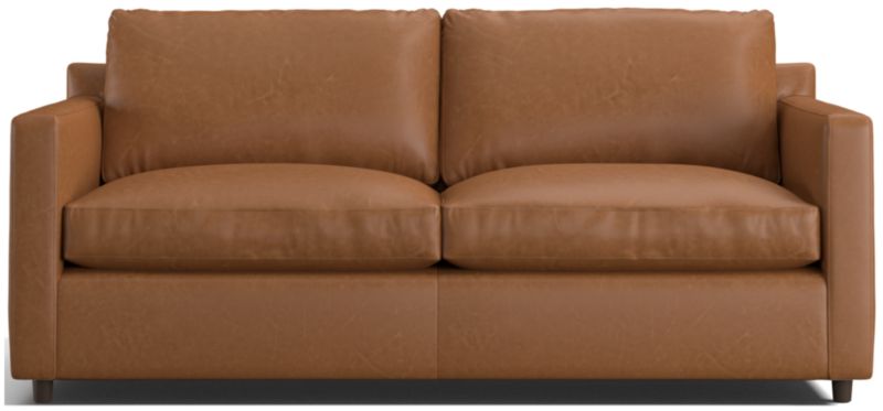Barrett makes leather seating comfortable, casual and modern. Like fine leather apparel, the full-grain leather feels buttery to the touch and tailors the sofa's clean lines with a graceful drape. The two-seat sofa sits upright and comfortable and is styled with track arms, topstitching and recessed legs that float its stylish silhouette. The Barrett leather track-arm sofa is a Crate & Barrel exclusive.