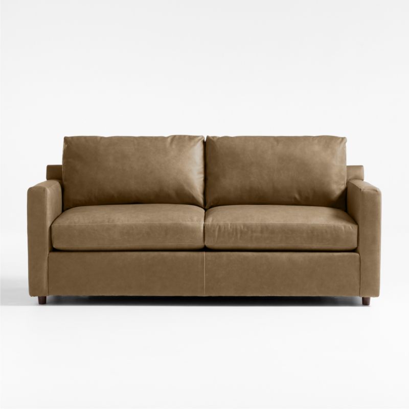 Barrett makes leather seating comfortable, casual and modern. Like fine leather apparel, the full-grain leather feels buttery to the touch and tailors the sofa's clean lines with a graceful drape. The two-seat sofa sits upright and comfortable and is styled with track arms, topstitching and recessed legs that float its stylish silhouette. The Barrett leather track-arm sofa is a Crate & Barrel exclusive.
