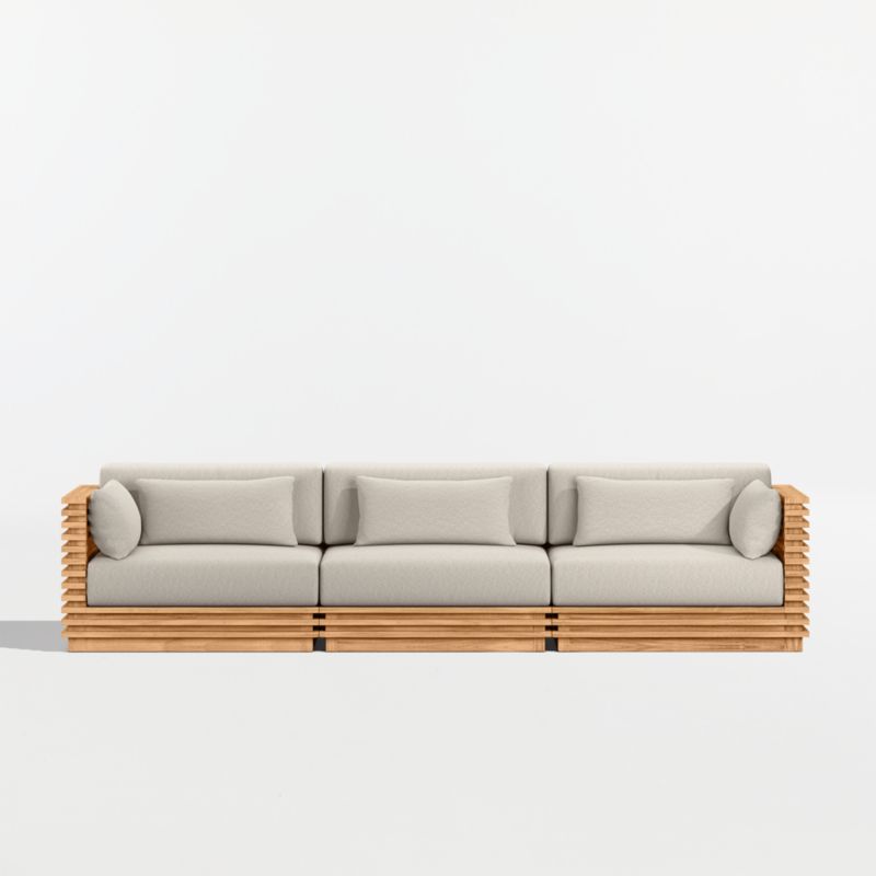 Modern and made for the outdoors, Batten's modular design flexes with your space and entertaining style. Crafted of sustainably sourced, unfinished solid teak, it is built to last a lifetime. The sofa's bold slats, striking linear profile and minimalist silhouette give it a distinctly modern look. A cozy mix of plush seat, back and lumbar cushions plus throw pillows provides unrivaled comfort and can all be upholstered in a weather-resistant fabric of your choice.