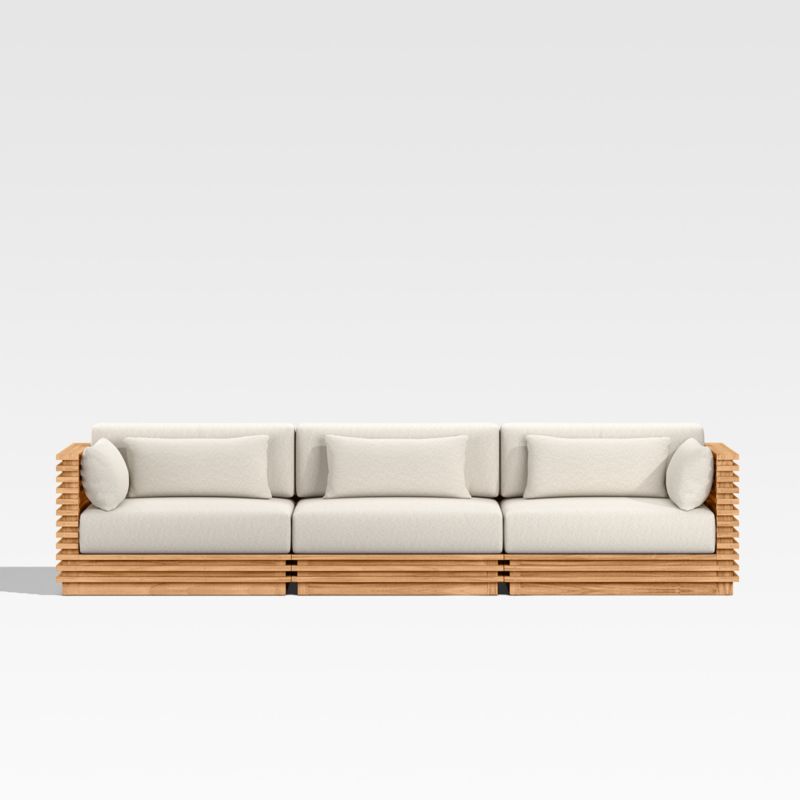 Modern and made for the outdoors, Batten's modular design flexes with your space and entertaining style. Crafted of sustainably sourced, unfinished solid teak, it is built to last a lifetime. The sofa's bold slats, striking linear profile and minimalist silhouette give it a distinctly modern look. A cozy mix of plush seat, back and lumbar cushions plus throw pillows provides unrivaled comfort and can all be upholstered in a weather-resistant fabric of your choice.