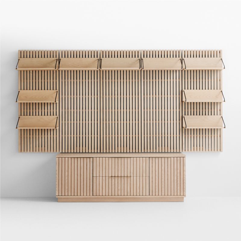 Showcasing our Batten collection's signature blend of modern design and natural materials, this modular home storage solution makes the most of wall space. We've put together this configuration to maximize storage in your living or media room, each piece made of beautiful oak veneer and crafted with dynamic linear interest. Five slatted back panels mount on the wall to provide a backdrop for affixing nine reversible shelves that hang with brackets on top or underneath to give you lots of storage options. Down below a freestanding media console clad in solid wood slats adds closed storage with a pair of drawers flanked by a cabinet on either side.