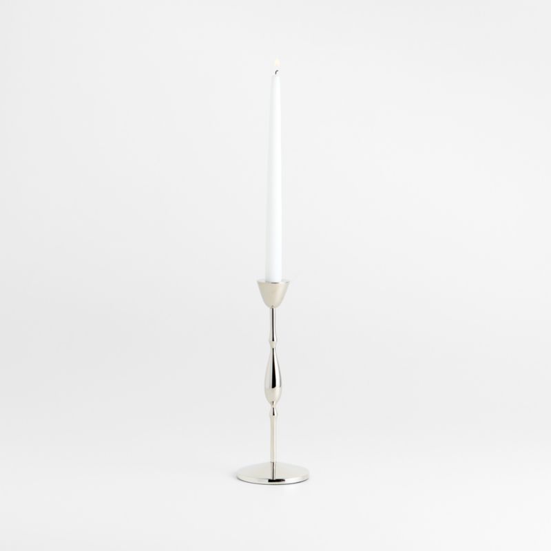Our take on traditional ornate candlesticks, this taper holder stretches and streamlines the classic silhouette into something sculptural and abstract. Crafted of cast brass with a nickel finish, the candlestick evokes drops of molten silver. We especially love the way candlelight gleams on the highly polished chrome. Pair the small beaded taper holder with the larger coordinating candlesticks to set the table with modern glam.
